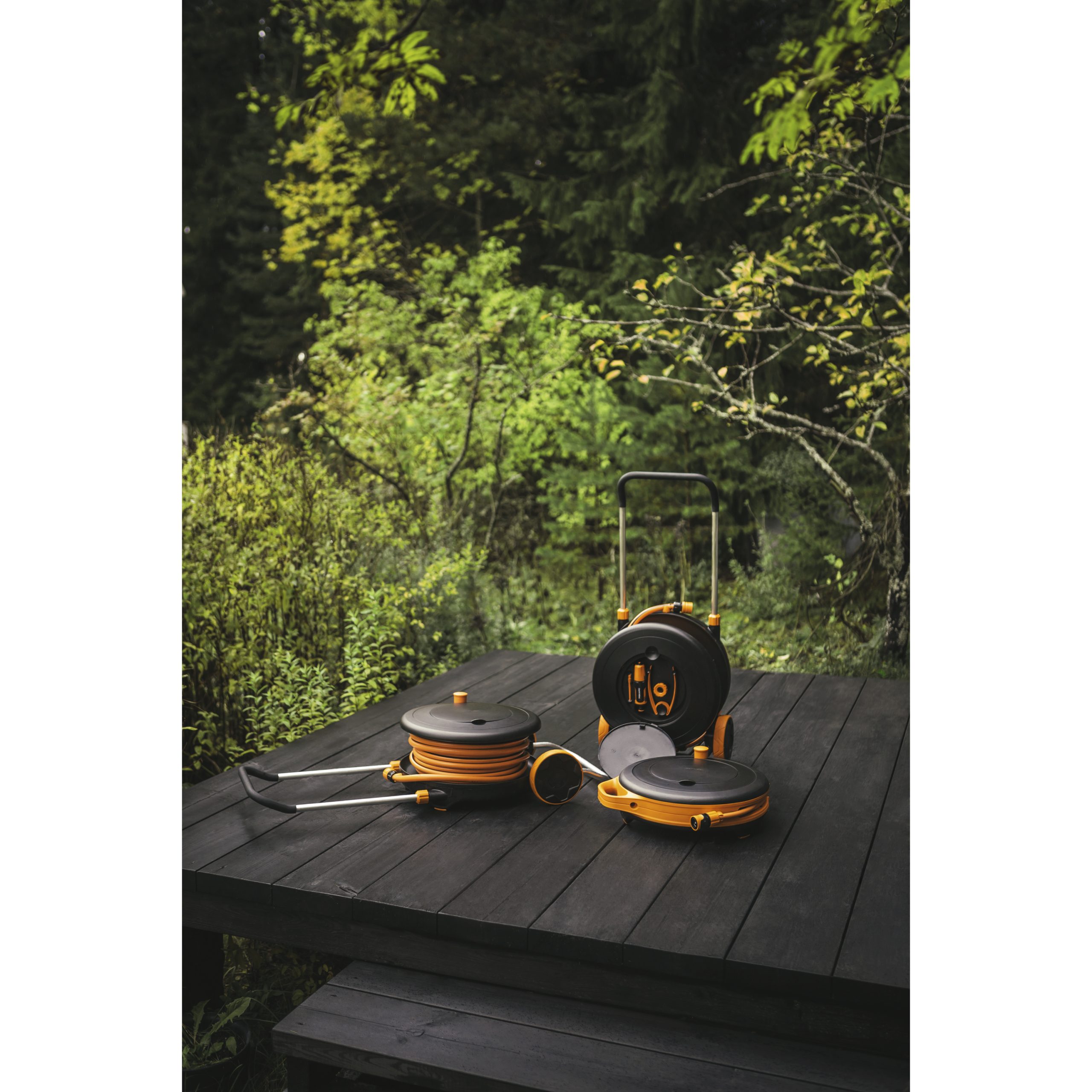 • Hortum makarası arabasındaki pratik saklama bölmesi, bir sulama mızrağı, evrensel bir musluk bağlantısı, arabayı kilitlemek için bir mandal ve mızrağı sprinkler olarak kullanmak için bir tutucu ile donatılmıştır.
